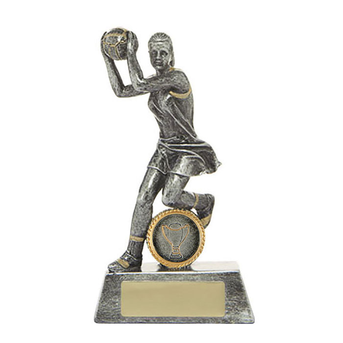 Award your aspiring netball superstars with this great netball trophy. Capturing a player in motion, finished in classic antique silver and gold. These netball trophies are available in 4 convenient sizes with space for your free club logo centre and free engraving.