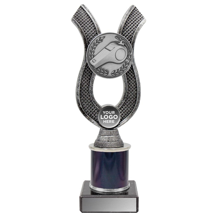 The Anchor Whistle trophy offers a uniquely shaped award with a finely detailed metal centre ontop of a classic marble base. These impressive trophies are available in 3 sizes (180mm, 230mm or 280mm) and are finished in antique classic silver colours. The price includes the free addition of your club, school or event logo and free engraving on a silver metal plate.
