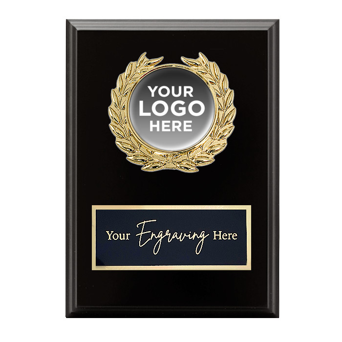 The Black Plaques are one of our most popular awards. This generic option allows you to showcase your own 50mm logo centre within the metal gold laurel wreath. Simply upload your club/team/school/business logo or any image you wish and it will be featured in the centre of the award! Your free engraving is presented beautifully on a metal plate below the motif. The reverse side of the plaque features both a wall mount and desk stand option.