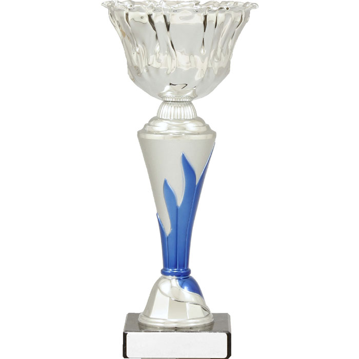 The Blue Flame cup features a brilliant blue and silver design. These contemporary metal cups are mounted on a stylish marble base. Available in 1 size with space for your free engraving on a silver metal plate.