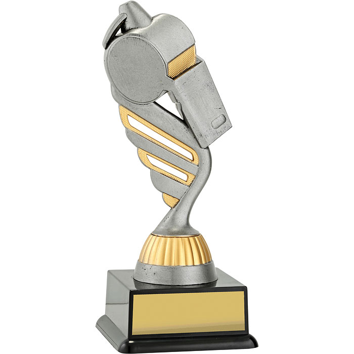 The Budget Silver Whistle is a classic trophy choice to present to that special umpire, referee, coach or manager. Featuring a whistle theme finished in antique silver and gold colours on top of a stylish black base. Available in 1 size with space for your free engraving.