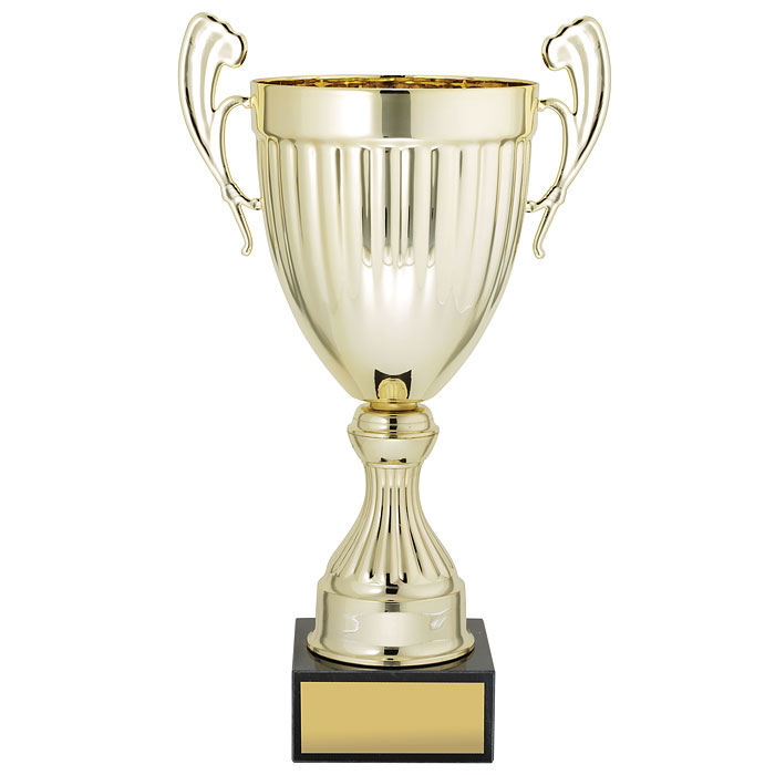 The Endeavour Cup Gold features a stylish metal bowl with handles and a classic marble base. These trophy cups are available in 5 great sizes and include free engraving on a gold metal plate.