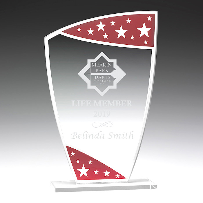 The Glass Red Sparkle Star award offers an affordable option suited for wide variety of events. With a brilliant multi-star design these striking glass awards offer a premium choice for recognition and appreciation. The price includes free frosted/etched engraving. Enter the wording that you would like engraved (and logo if you have one) and our talented engravers will design a layout for you. If you would like to receive artwork proofs for your approval before manufacture, please let us know in the additional comments section upon checkout.