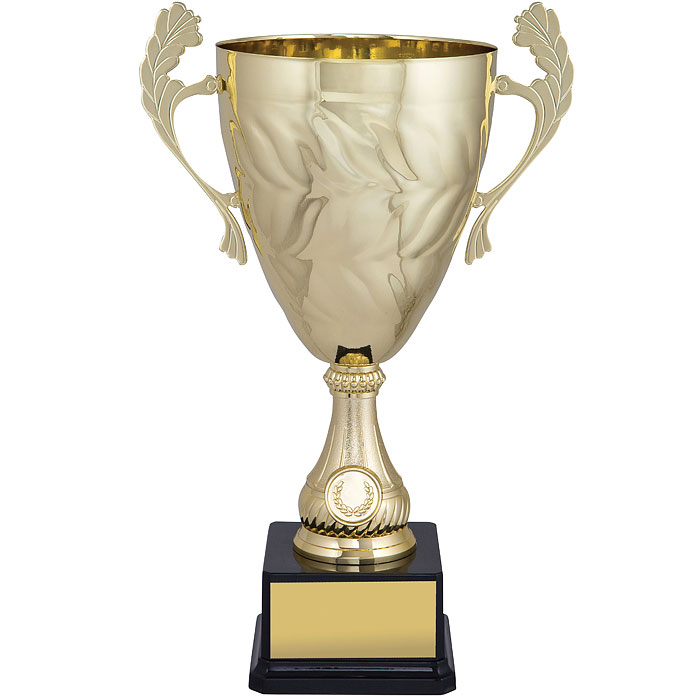 The Gold Honour Cup series offers a range of well sized gold coloured award cups. The striking gold metal cup with handles is fixed atop a classic black base. These trophy cups are available in 4 sizes and include free engraving on a gold metal plate.