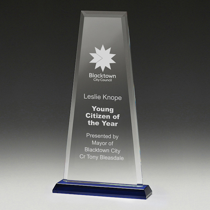 The Guardian Blue Glass Awards are part of our extensive corporate range. These striking glass awards offer a premium choice for recognition and appreciation. Price includes the addition of your logo and frosted (etched) engraving. If you would like to receive artwork proofs for your approval before manufacture, please let us know in the additional comments section upon checkout.