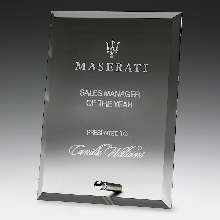 The Prime Glass Plaque Awards are part of our extensive corporate range. These premium 10mm thick plaques are perfect for corporate, school and sporting awards. Available in Clear, Black or Blue. The awards are held up by a small metal rod positioned through the bottom of the award. Price includes the addition of your logo and frosted (etched) engraving. If you would like to receive artwork proofs for your approval before manufacture, please let us know in the additional comments section upon checkout.