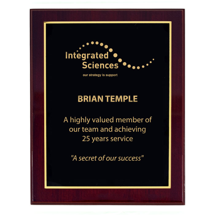 The Rosewood Wall Plaques (with black/gold plates) are part of our extensive corporate range. These outstanding awards offer a premium choice for recognition and appreciation. Featuring a gloss rosewood timber plaque with a gloss black face plate. These are engraved to show gold wording and logo details. Can be hung on the wall or stand on a desk with the supplied rod stand. The price includes free frosted (etched) engraving.