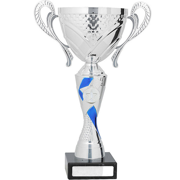 The Silver / Blue Trident series of cups present a stylish trophy option. Finished in stunning silver and blue colour combination with a marble base. These trophy cups are available in 5 great sizes with space for your free club, school or event logo and free engraving on a silver metal plate.