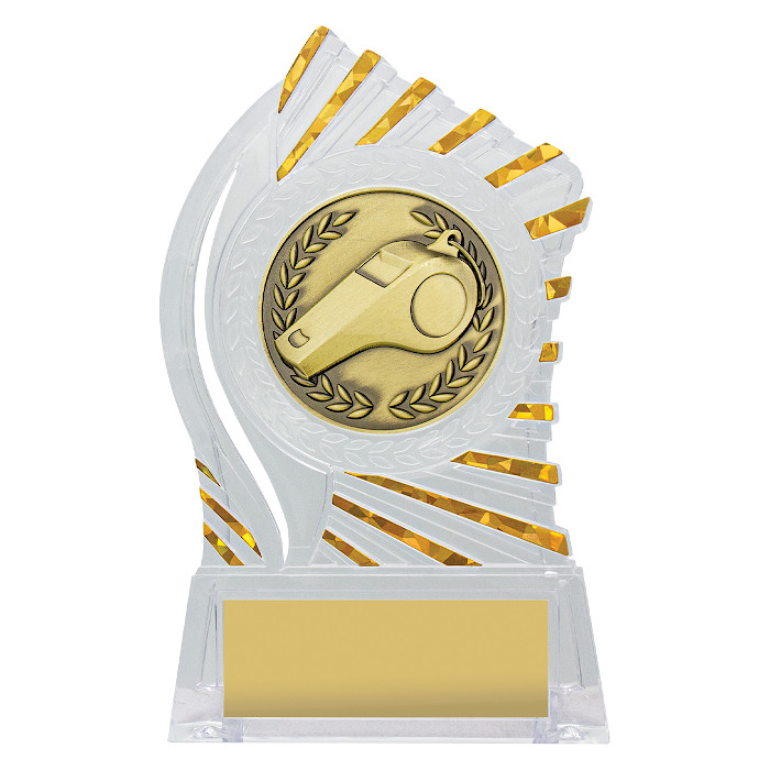 The Solar Acrylic Whistle Awards present a terrific low-cost option that will keep your bank balance happy! These durable stand-style, acrylic awards feature a gold metal motif depicting your sport/activity and have a bright gold dazzling sunray surround. The price includes free engraving on a gold metal plate! These incredible value awards are available in the following sizes: 145mm.
