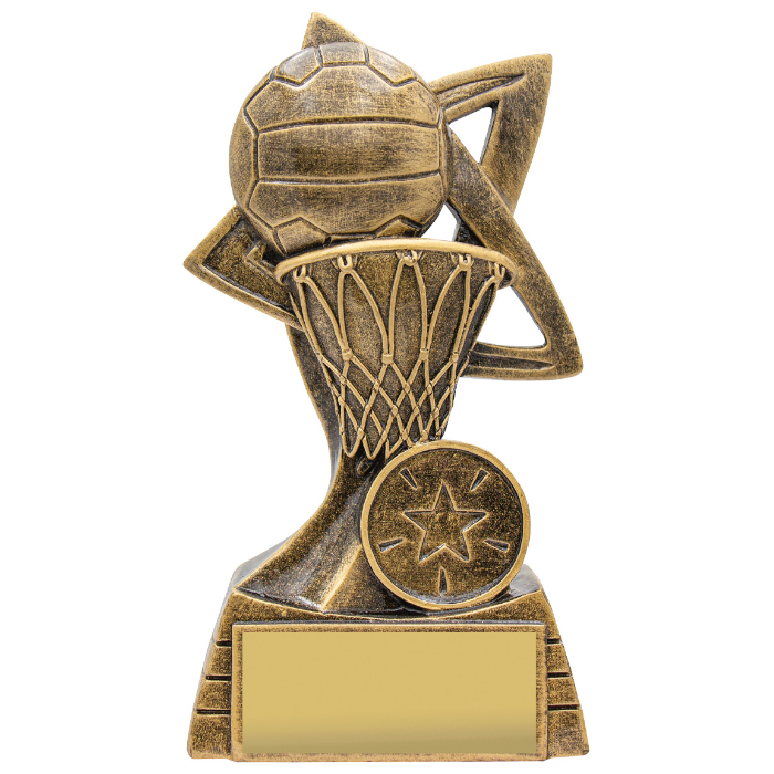 The Spinifex Netball trophy presents a classic antique gold award with an ball, net and star theme. These great value trophies are available in 2 sizes and include space for your free logo centre and free engraving.