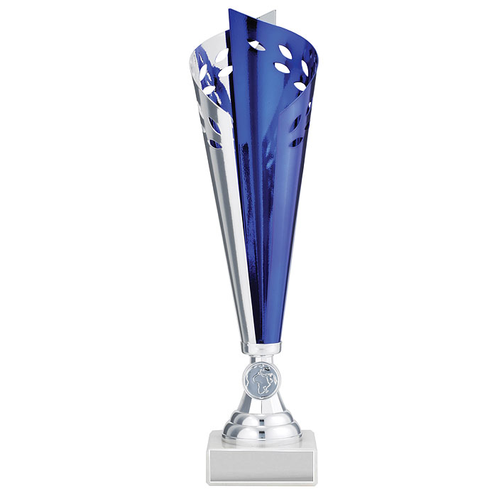 The Wreath Cup Blue & Silver presents an innovative design perfect to recognise the achievements of your award winners. Finished in stunning silver and blue colour with a stylish marble base. These trophy cups are available in 3 great sizes with space for your free club, school or event logo and free engraving on a silver metal plate.
