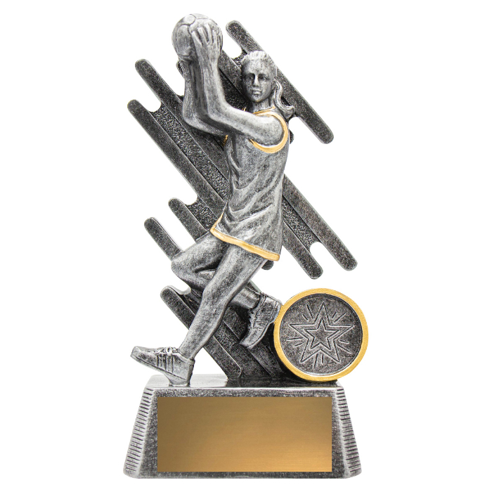 The Zoom Netball Player trophy offers a brilliant new modern design showcasing a player in action against a stylised backdrop. These netball trophies are available in 5 great sizes and include space for your free logo centre and free engraving.